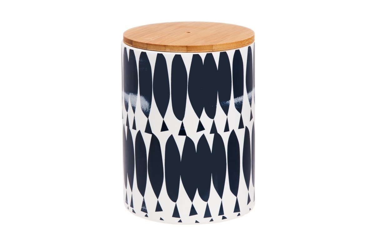Sinivalkoinen muikkukuosinen keraaminen säilytyspurkki puisella kannella. Koko 13,5 x 13,5 x 21,2 cm.