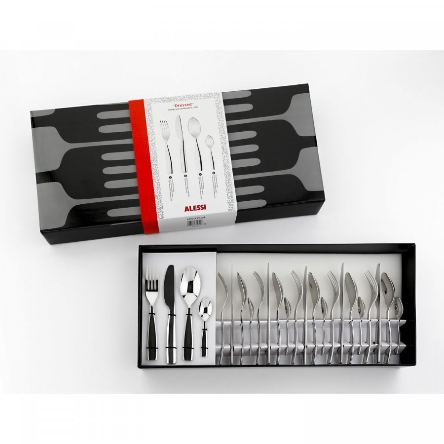 Aterinsetti merkiltä Alessi, muotoillut Marcel Wander. Kaunis 24-oasinen aterinsetti sisältää 6 veistä, 6 haarukkaa, 6 lusikkaa ja 6 teelusikkaa. Sopii niin juhlaillallisille kuin arkikäyttöönkin. Valmistettu kiiltäväpintaisesta ruostumattomasta teräksestä.