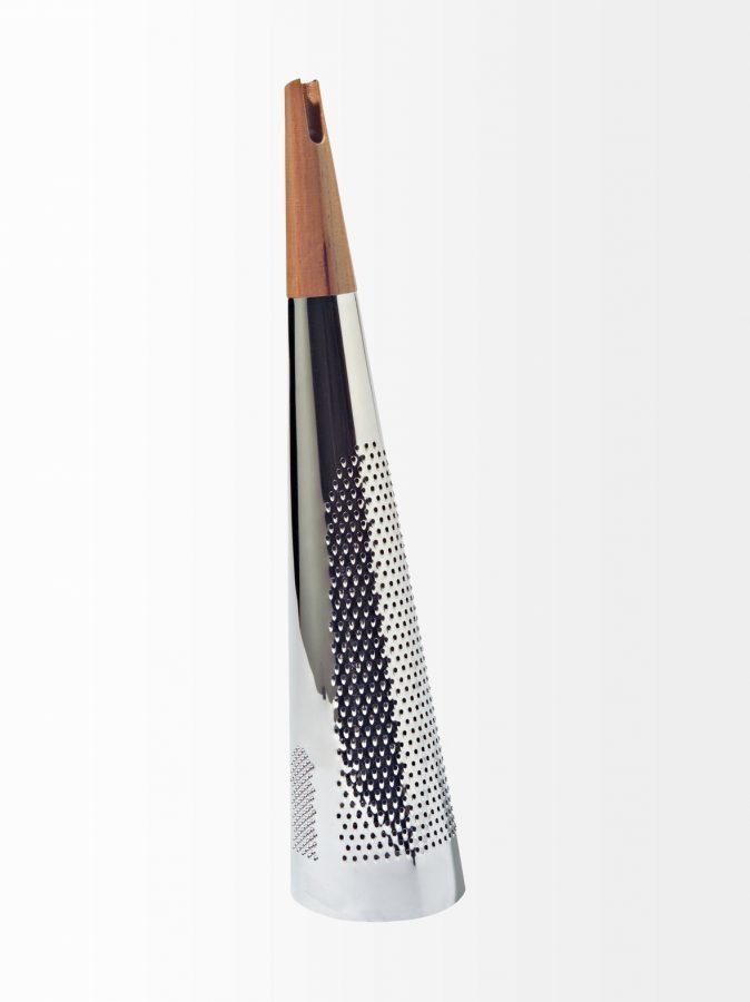 Linjakas juustoraastin on terästä ja puuta ja siinä on erilaisia raastinpintoja. Raastimen on suunnitellut Richard Sapper. Korkeus 46 cm.