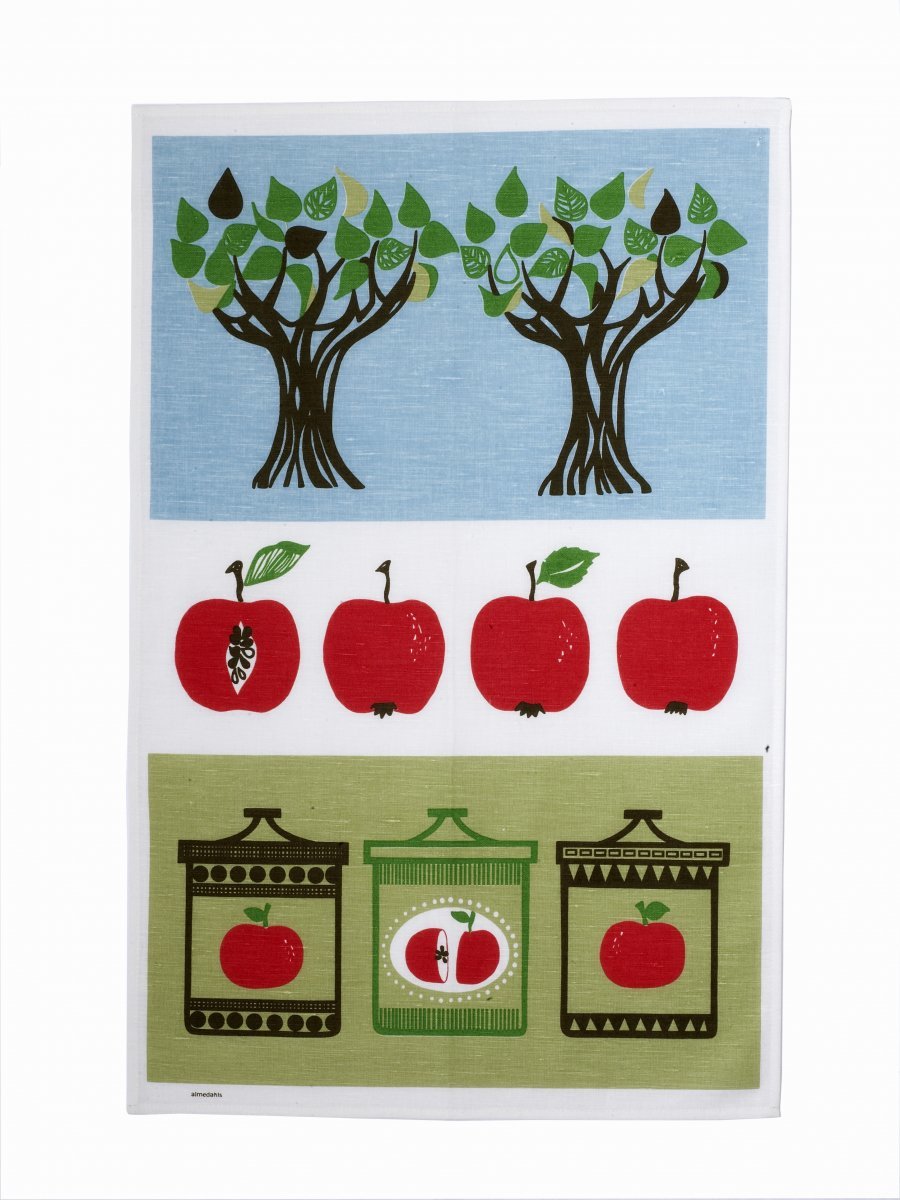 Tyylikäs Almedahlsin keittiöpyyhe jonka ajaton Äppelsylt –kuvio tuo 60-luvun retrohenkeä koko keittiöön. Keittiöliina on materiaaliltaan pellavaa ja puuvillaa ja se on konepestävä 60 asteessa.