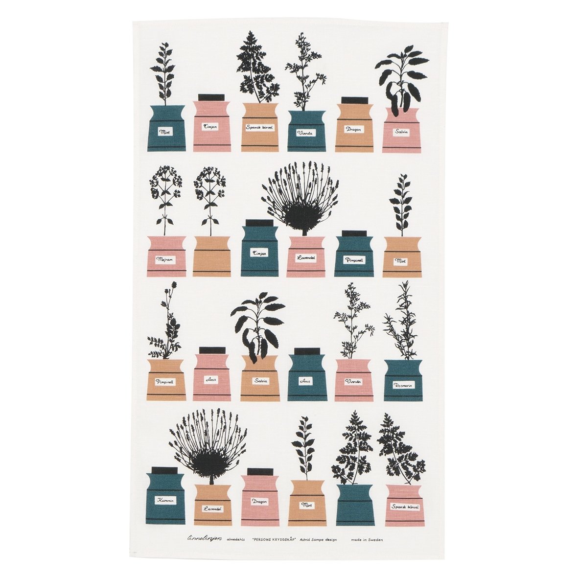 Kaunista keittiöpyyhettä koristaa Astrid Sampen kalssinen Persons Kryddskåp -kuvio. Almedahlin retrotyylinen keittiöliina on valmistettu puuvillasta ja pellavasta. Saatavilla on myös samaan sarjaan kuuluva patalappu. Konepesu: 60 C°.