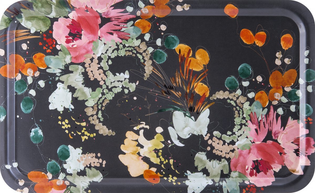 Isompi tarjotin Åry Home-merkin Garden Bouquet -sarjasta. Tarjotin on valmistettu Ruotsissa koivuvanerista ja kestävästä melamiinipinnoitteesta. Tarjottimessa on koristeena kaunis kukkakuviointi ja se on täydellinen niin aamupala- kuin kahvikattaukseenkin. . Garden Bouquet -sarjan tarjottimet valmistetaan käsin ja ne ovat tiskikonepesun kestäviä.