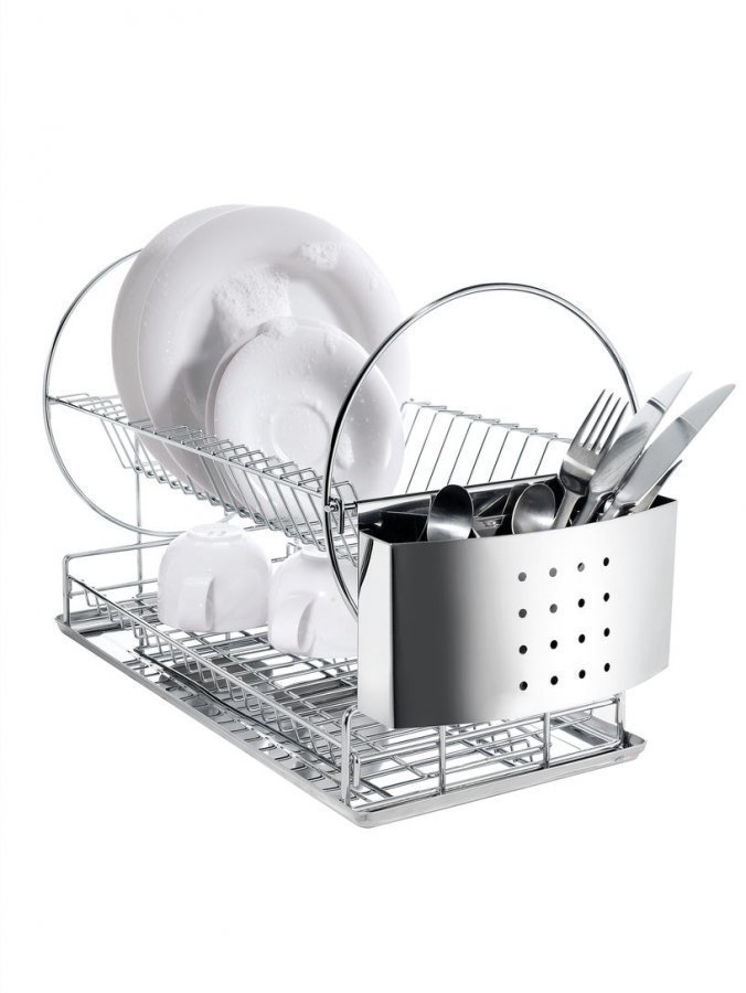 Astiankuivausteline. 2-kerroksinen. Kuivaustilan lisäksi telineessä on ruokailuvälinekori ja tippa-alusta. Ruostumatonta terästä ja kromia. K/L/S n. 29,5/40/20,5 cm.