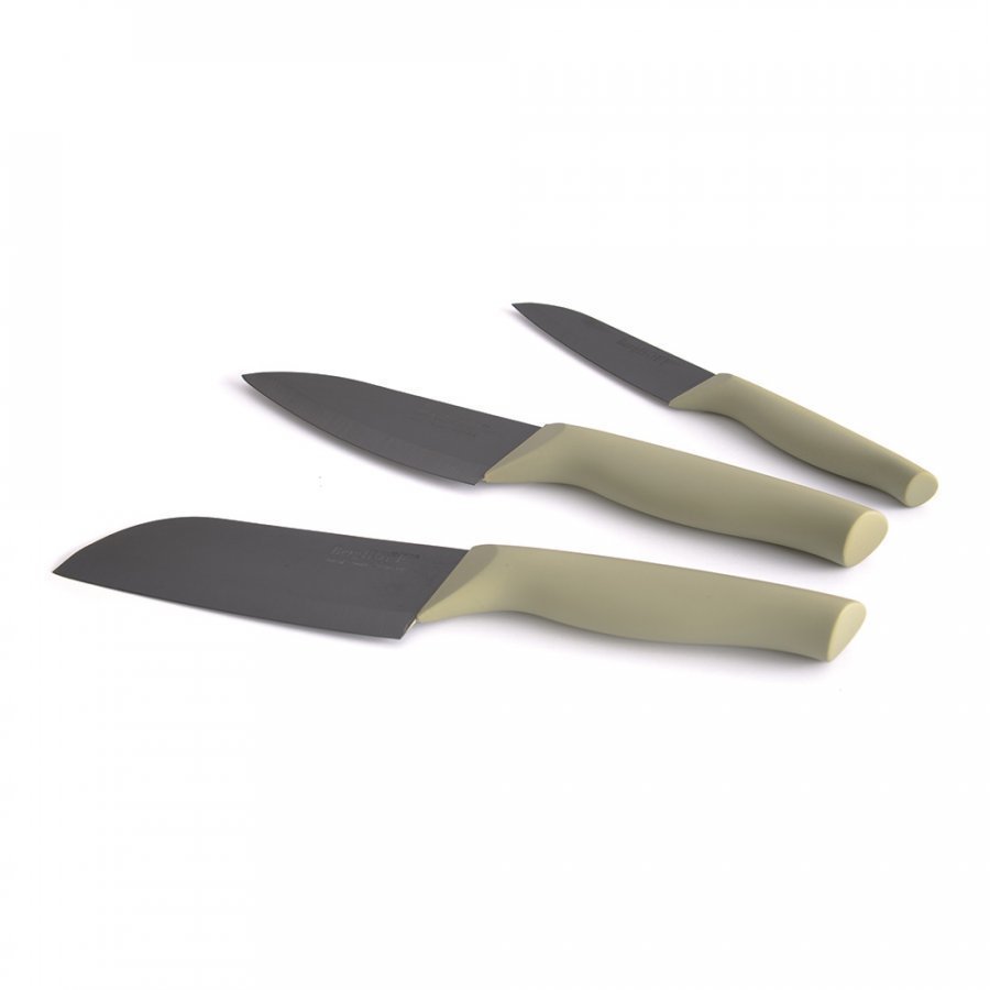 1x keraaminen kuorimaveitsi 10 cm. 1x keraaminen kokkiveitsi 13 cm. 1x keraaminen santokuveitsi 14 cm.