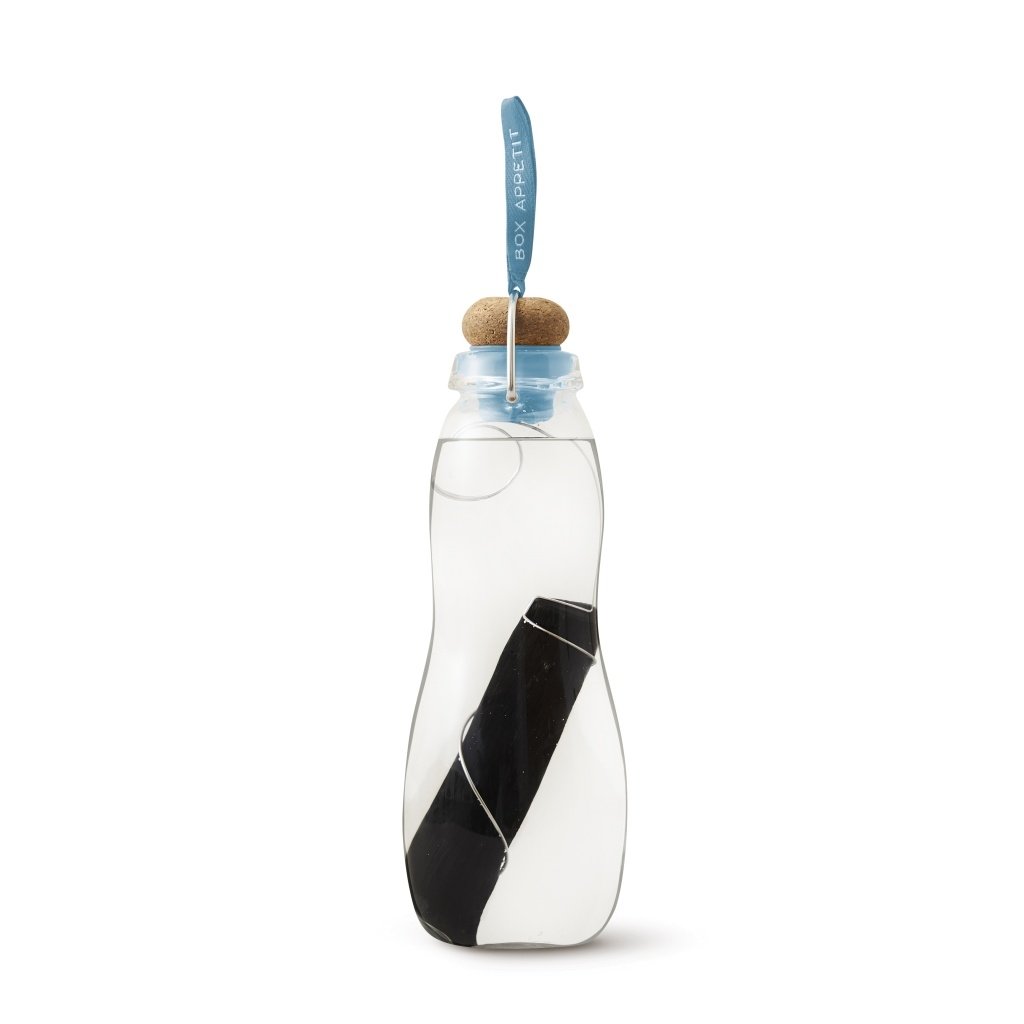 Black+Blumin tyylikkäässä lasipullossa on kauniit siniset yksityiskohdat. Japanilainen hiilisuodatin tunnetaan myös aktiivisena hiilenä, joka suodattaa klooria sekä tasapainottaa pH-arvoa. Hiilestä vapautuu veteen erilaisia mineraaleja, kuten rautaa, kalsiumia ja magnesiumia, mikä parantaa veden makua sekä terveysvaikutuksia. Jos käytät pulloa päivittäin ja täytät sen kerran päivässä, riittää hiili kolmen kuukauden ajaksi. Tämän jälkeen voit helposti ”ladata” hiilen uudelleen keittämällä sitä vedessä 10 minuutin ajan ja antamalla sen kuivua auringon valossa. Hiili riittää kaiken kaikkiaan kuudeksi kuukaudeksi, sitten se pitää vaihtaa uuteen.