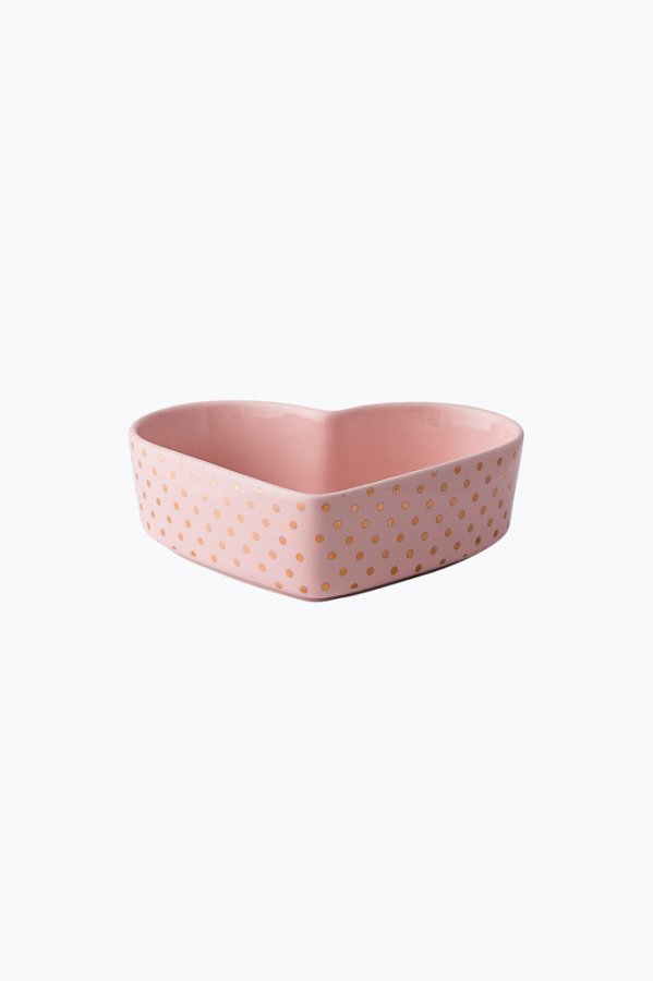 Sydämenmallinen keramiikkavuoka. Roosa, kullanväriset pilkut. L15xP13,5xK5 cm. Konepesu.