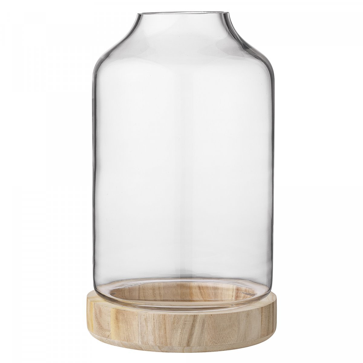 Tyylikäs lasinen kynttilälyhty puisella vadilla. Lyhty valaisee kauniisti pimeät illat ja toimii koriste-esineenä.