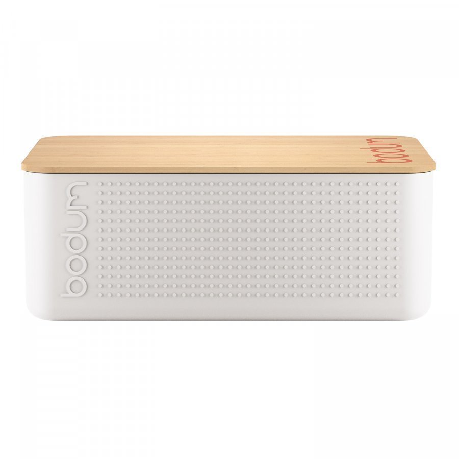 Bistro leipälaatikko merkiltä Bodum. Kätevä laatikko tuoreen leivän säilytykseen. Kantta voi käyttää leikkuulautana. Leikkuulaudassa on syvät urat muruja varten, ja se on valmistettu bambusta. Laatikko on valmistettu BPA-vapaasta muovista, joka kestää konepesun. Saatavana mustana ja valkoisena.