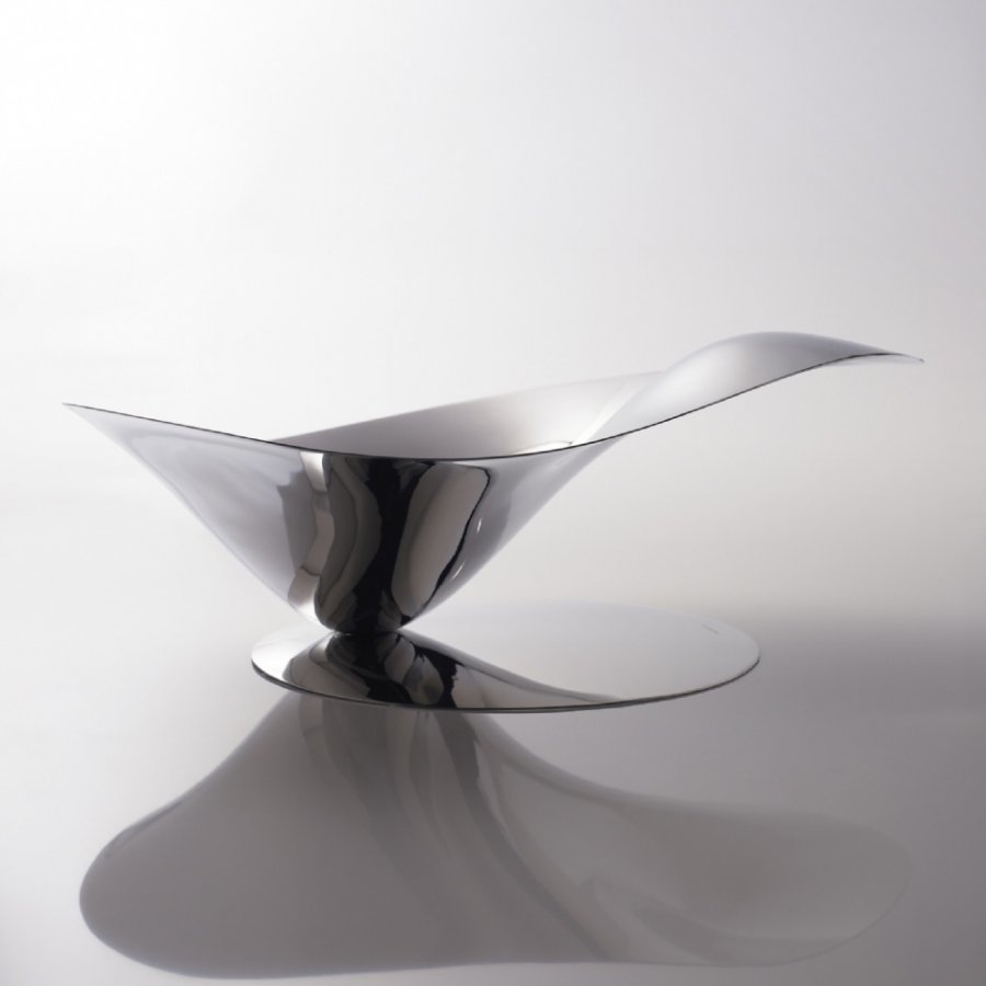 Bugatin tyylikäs Petalo-sarjan hedelmäkulho lepää kauniilla yhteensopivalla alustalla. Materiaali: kiiltävä ruostumaton teräs.