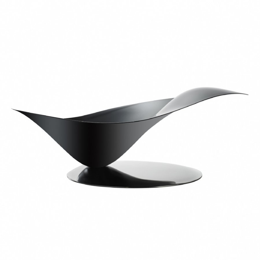 Bugatin tyylikäs Petalo-sarjan hedelmäkulho lepää kauniilla yhteensopivalla alustalla. Materiaali: kiiltävä ruostumaton teräs.