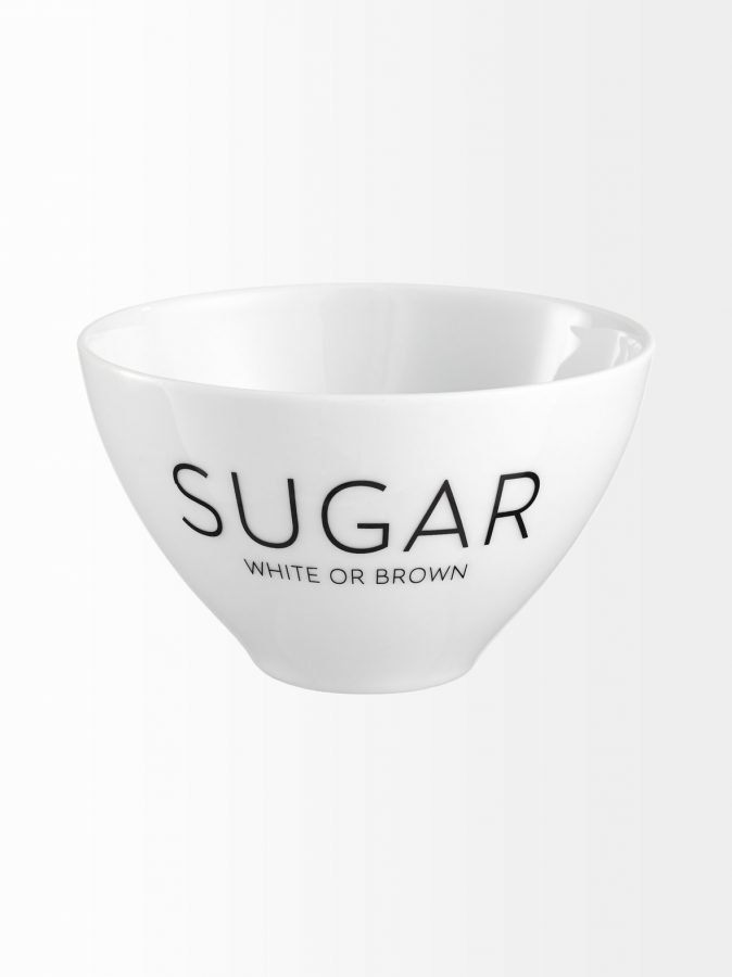 Tekstikuvioitu sokerikko on konepesunkestävää posliinia. Halkaisija on 10,5 cm.