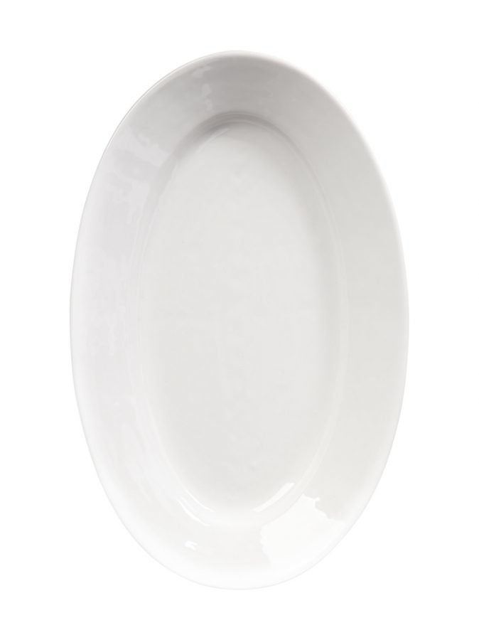 Pelkistetyssä tarjoilulautasessa on kaunis ovaali muoto. Materiaali on lasitettua posliinia. Käsinpesu.
