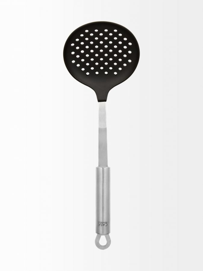 Näppärä reikäkauha sopii apuvälineeksi esimerkiksi friteeraukseen ja nestepitoisten ruokien valuttamiseen. Materiaali on muovia ja ruostumatonta terästä. Pituus 34 cm.