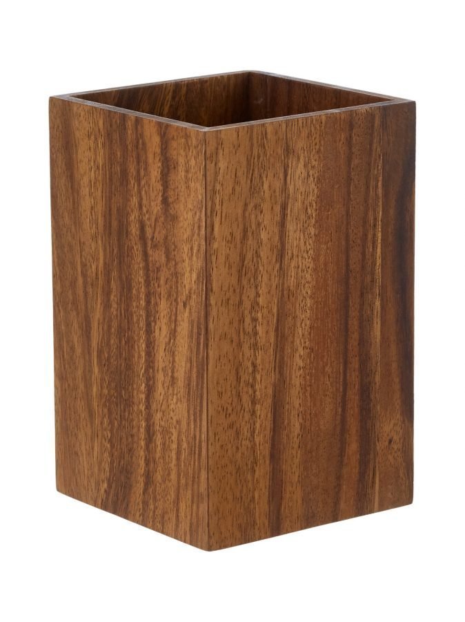 Tyylikkäässä säilytystelineessä aterimet pysyvät järjestyksessä. Materiaali on akaasiapuuta. Mitat ovat 9,5 x 15 cm.