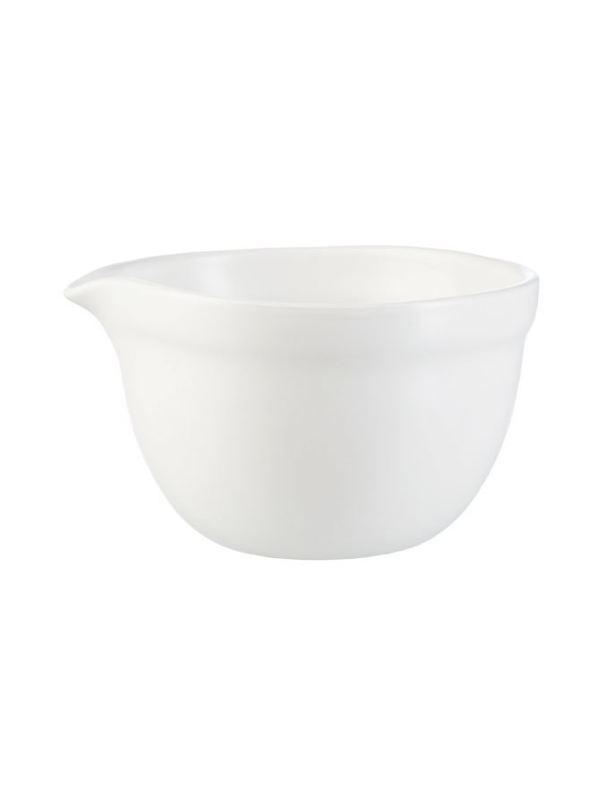 Sekoituskulhossa on pieni nokka. Kulho on keramiikkaa. Korkeus on 9 cm, halkaisija 15 cm.