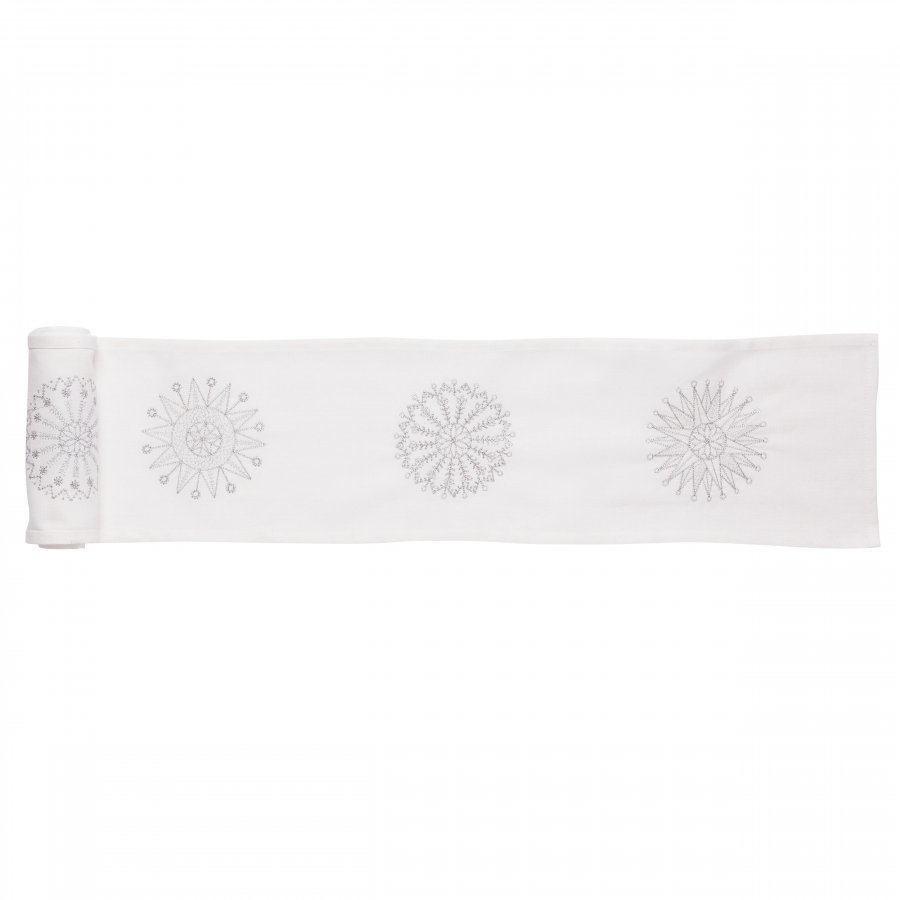 Valkoinen kaitaliina, jossa on hopealla kirjottuja lumitähtiä. 50% puuvillaa ja 50% polyesteriä. Hienopesu 30 asteessa.