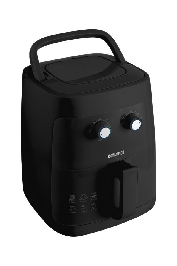 Champion Aero Fryer -friteerauspata, jonka avulla friteeraat, paistat tai grillaat erilaiset raaka-aineet ilman lisättyä rasvaa. Reilu 2,5 litran kori ja kätevät säädöt. Fantastisen rapea lopputulos. Vähemmä öljyä herkullinen maku Toisin kuin tavallisten friteerauspatojen kanssa et tarvitse lisättyä öljyä. Ruoasta tulee terveellisempää ja valmistuksen aikana syntyy vähemmän paistokäryä. Sinun ei myöskään tarvitse huolehtia käytetyn öljyn hävittämisestä. – Ajastimen merkkisignaali ja automaattinen virrankatkaisu – Ylikuumenemissuoja – Analoginen säätöpaneeli – Friteeraa ilman öljyä – Nopea lämminilmapuhallin ja kiertoilmateknologia – Säädettävä lämpötila 80ºC 200ºC – Ylhäällä kantokahva, joka helpottaa käsittelyä ja siirtelyä – Tilavuus 2,5 l – Teho 1400 W