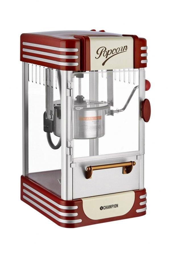 Champion-popcorn-kone, jossa on aitoa elokuvatunnelmaa! Retrohenkinen ja kompakti kone mahtuu hyvin esim. tiskipöydälle. Koneen sisällä on pieni kattila, johon laitetaan voi tai öljy sekä maissinjyvät. Hetken kuluttua jyvät muuttuvat popcorneiksi ja putoavat säiliöön, missä ne pysyvät sopivan lämpiminä. Isot ikkunat ja sisäänrakennettu valo. Kone on helppo puhdistaa ja kattilan voi irrottaa huolellista pesua varten. Tekniset tiedot – Elokuvatyylinen popcorn-kone – Valmistaa popcornit muutamassa minuutissa – Suositeltu määrä/kerta: 1 3 dl – Sisäänrakennettu valo – Edessä luukku – Koko (ulkomitat): 45,5 x 27 x 23,5 cm – Jännite 230 V – Johdon pituus 50 cm – Mukana popcorn-mitta ja öljy