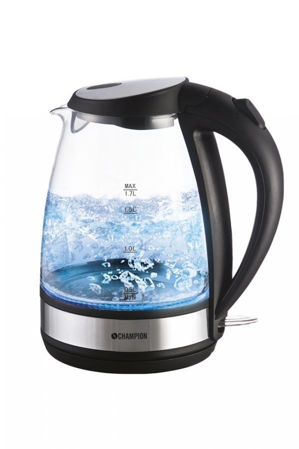 Champion CHVK210 -vedenkeitin, jossa lasinen kannu. Voit seurata veden lämpenemistä, sillä pohjassa on sininen LED-valo. Vetoisuus 1,7 l. Läpinäkyvästä kannusta on helppo tarkistaa vesimäärä. Sininen valo Pohjan sininen LED-valo tekee kannusta tyylikkään ja modernin. Elegantti kannu sopii jokaiseen keittiöön. Tekniset tiedot: – Virta: 220–240 V/50 Hz – Teho: 1850–2200 W – Vetoisuus 1,7 l – 360º astetta pyörivä alusta – Lämmönkestävä lasikannu – Piilolämpöelementti – Kuiviinkiehumisen esto – Automaattinen virrankatkaisu veden kiehuessa – Sininen LED-valo