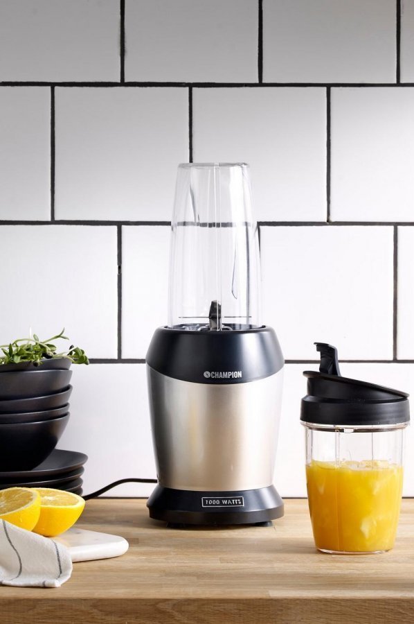 Klassinen Champion Nutrition blender on tehokas tehosekoitin, jolla valmistat terveellisiä juomia ja ruokia. Tehokas 1000 watin moottori varmistaa, että saat hedelmistä ja vihanneksista runsaasti ravintoaineita. – 1000 watin nutrition blender -tehosekoitin, jolla valmistat mehut, smoothiet ym. – Säiliö BPA-vapaata tritaanimuovia – Turvakansi – Mukana 800 ml:n ja 500 ml:n säiliö, teräyksikkö, turvakansi ja kansi, jossa kaatonokka – Erityismuotoiltu terä pyörii 25 000 kierrosta minuutissa ja murskaa helposti pähkinät, jääpalat ym. kovat ainekset – Helppo käyttää ja puhdistaa