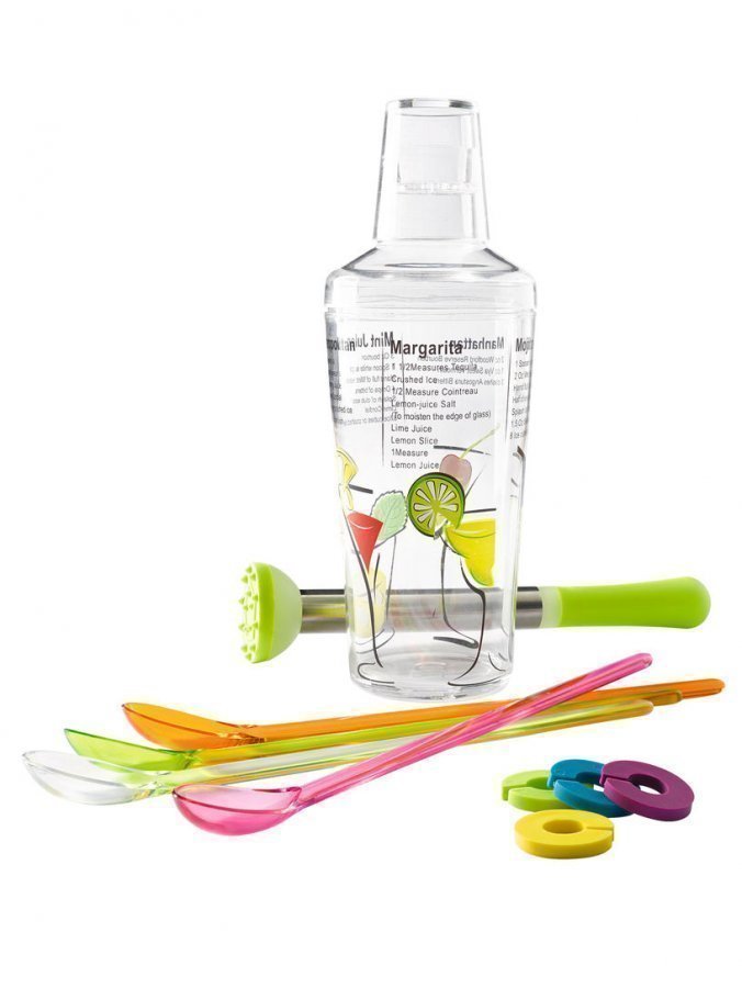 Valmista herkulliset cocktailit kätevästi kotona! Setti sisältää miltei kaiken tarvittavan upeiden drinkkien valmistukseen: shakerin, survimen, 4 pitkää lusikkaa ja 4 eriväristä lasimerkkiä. Valmistettu muovista. Käsinpesu. Mitat: shkaer n. 21 x 8,5 cm, survin n. 21,5 x 4 cm, mitta-astia n. 5,5 x 4,2 cm, lasimerkki n. 2,8 x 0,4 cm, lusikka n. 22,5 x 2,5 cm. Materiaali 35 % akryylia, 35 % jaloterästä, 30 % muovia.