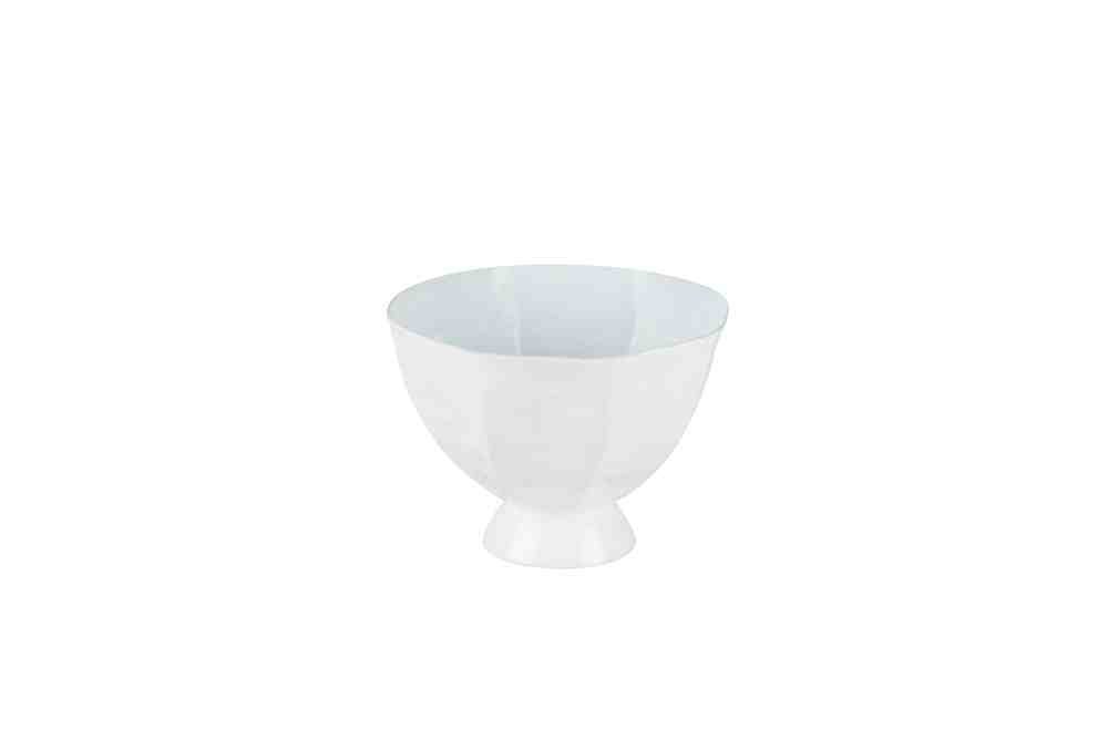 Kaunis metallinen kulho kiiltävällä valkoisella pinnalla. Kulho sopii mainiosti naposteltavien tarjoiluun.
