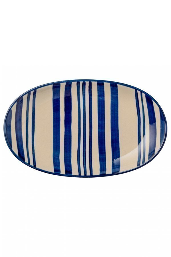 Soikea keramiikkalautanen, jossa käsin painettu raidallinen kuvio. Kestää konepesun. Leveys 13 cm x pituus 21,5 cm.