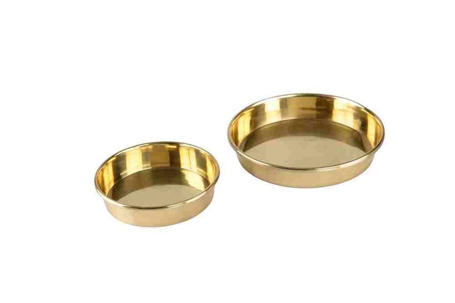 Kaksi kaunista messingistä valmistettua vatia. Pienempi vati on 10 cm halkaisijaltaan ja suurempi 12 cm.