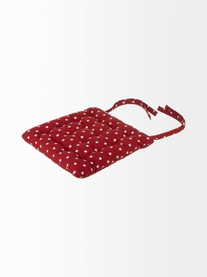 Kuviollinen istuintyyny kiinnitetään solmittavilla nauhoilla. Materiaali on 100 % puuvillaa. Käsinpesu.
