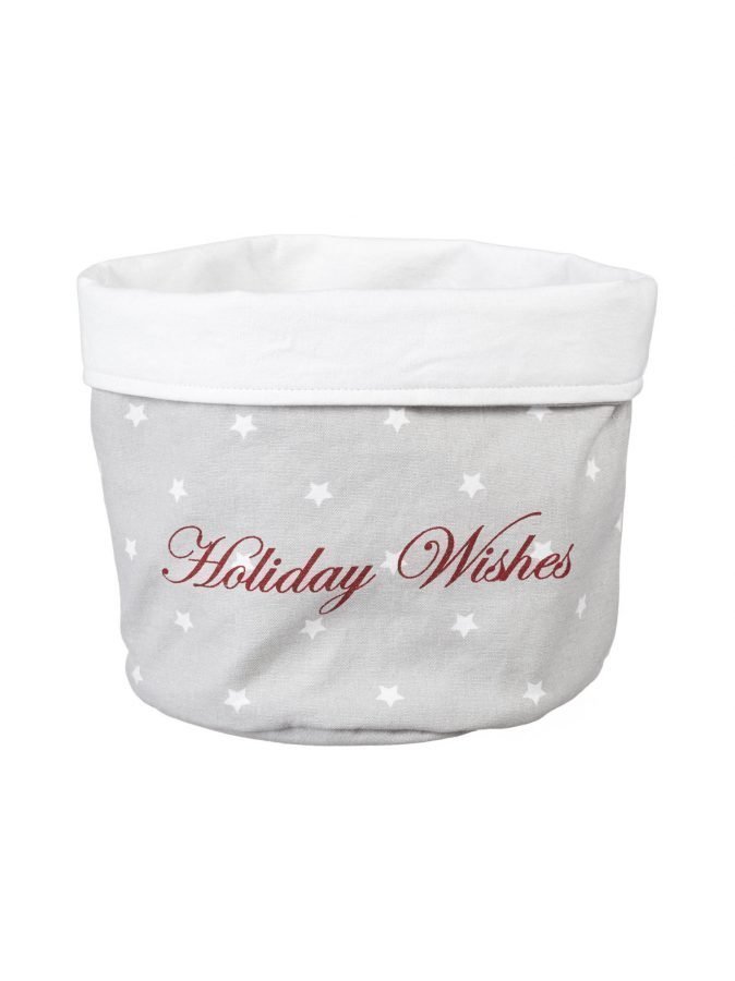 Tähtikuvioidussa kangaskorissa on jouluaiheinen tekstipainatus. Halkaisija on n. 22 cm. Materiaali on 100 % puuvillaa. Konepesu 40 °C.