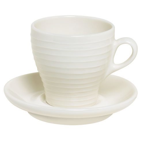 Blond cappuccinokuppi ja lautanen. Blond on Reliefgruppenin suunnittelema kaunis posliinisarja, joka kestää vuodesta toiseen. Valmistettu kalsiumia sisältävästä posliinista. Ei ihmekään, että Blond-sarja on suosittu niin muotoilua rakastavien kuin huippuravintoloiden keskuudessa. Raidat ja pilkut antavat astioiden muuten klassiselle ilmeelle kauniin viimeistelyn.