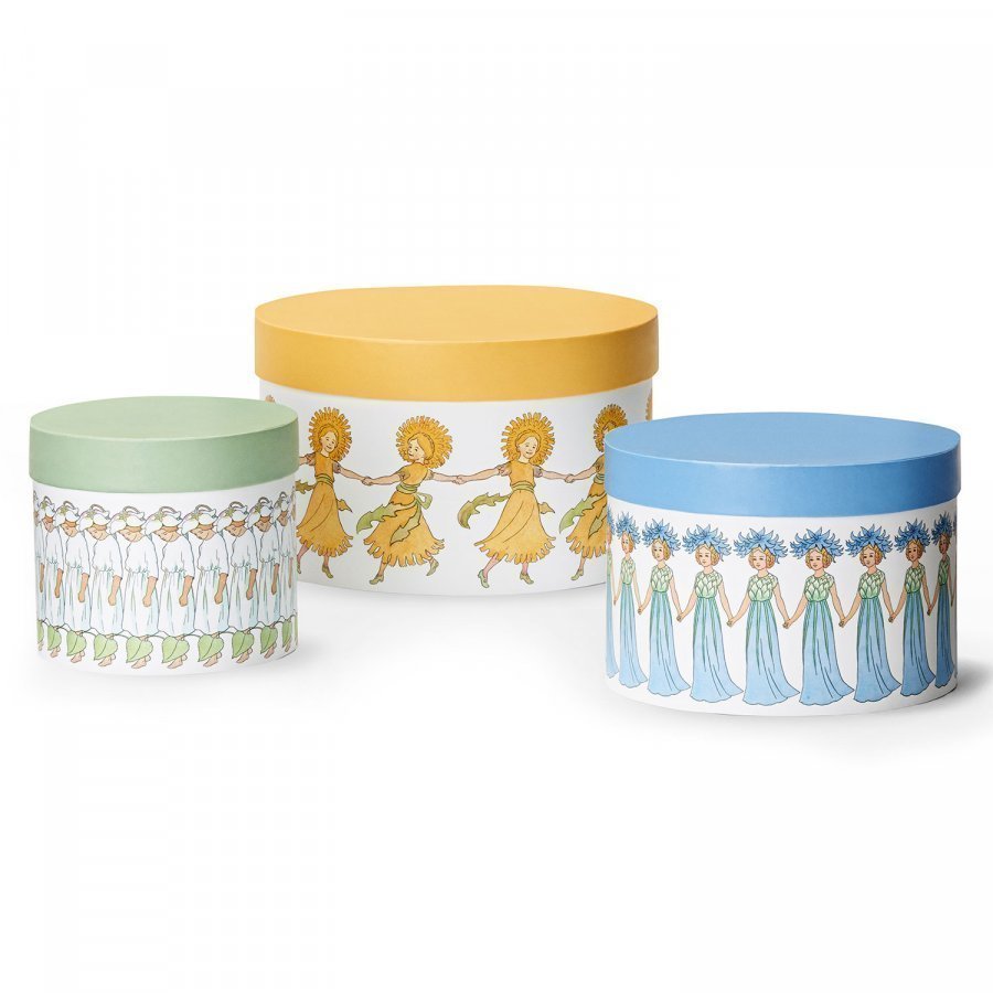 Kolmen laatikon setti, useassa eri koossa, valmistettu pahvista. Pieni Ø13cm, korkeus 11cm, Medium Ø18cm, korkeus 12,5cm ja Suuri; halkaisija 21cm ja korkeus 13cm.