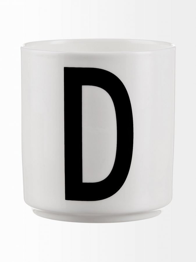 Yksinkertaisen tyylikkään kirjainmukin typografian on suunnitellut Arne Jacobsen. Korvaton muki soveltuu juomien lisäksi piensäilytykseen. Valmistaja on Design Letters. Materiaali on posliinia. Halkaisija on 7,5 cm, korkeus on 8,5 cm.