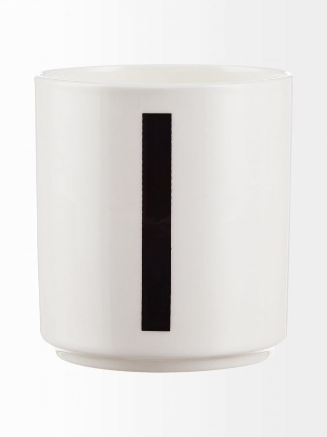 Yksinkertaisen tyylikkään kirjainmukin typografian on suunnitellut Arne Jacobsen. Korvaton muki soveltuu juomien lisäksi piensäilytykseen. Valmistaja on Design Letters. Materiaali on posliinia. Halkaisija on 7,5 cm, korkeus on 8,5 cm.