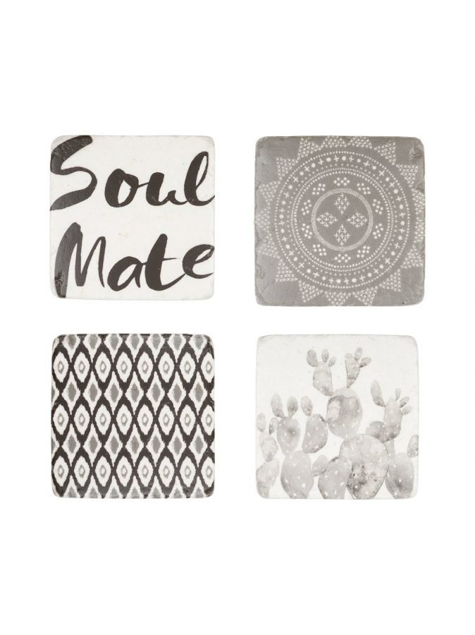 Settiin kuuluu neljä lasinalusta. Lasinalusissa on kaunista kuviointia. Lasinalusen koko on 10,2 x 10,2 cm.