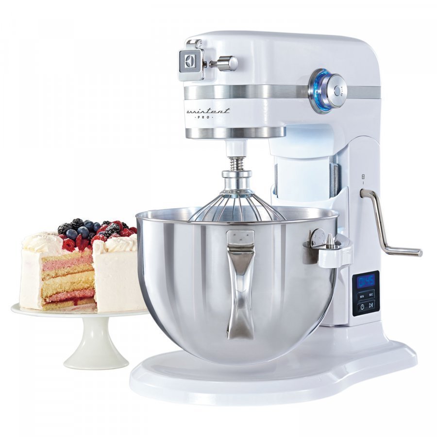 Monitoimikone PRO. Elegantti metallinen keittiökone 7,5l kulholla ja nostomekanismilla. Integroitu LED-valaistus, pulssitoiminto, LCD-näyttö joka näyttää kuinka monta minuuttia on kulunut ja joka voidaan myös ohjelmoida ajastimeksi. Tehokas 1200W moottori, 10 nopeusvaihtoehtoa ja valaistu nuppi. Mukana 3 tarviketta: vispilä, taikinakoukku ja vatkain. Roiskesuoja kuuluu mukaan.