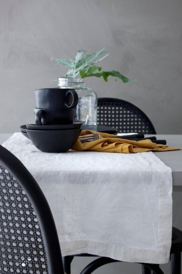 Kaitaliina pestyä pellavaa. Koko 40×150 cm. Silitä sileäksi tai rumpukuivaa matalassa lämpötilassa ja ripusta kuivumaan hieman kosteana, niin pellava säilyttää luonnollisen, hieman ryppyisen ja elävän pintansa.