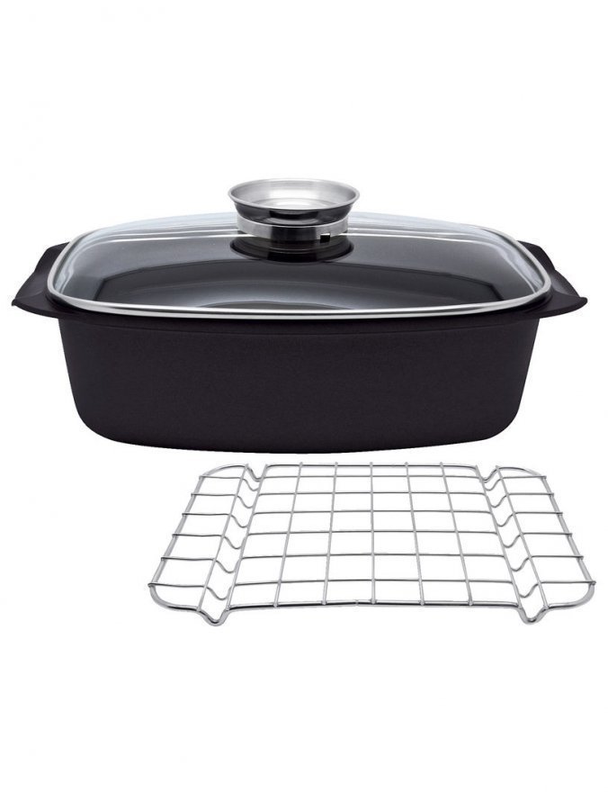 Kannellinen paistinpannu yleiskäyttöön, massiivista, energiaa säästävää alumiinivalua. Siinä on erinomainen lämmönjohto- ja lämmöntallennuskyky. Kuumuus johdetaan myös seinämiin. Oikea kypsymislämpötila saavutetaan nopeasti ja se säilyy pitkään saman lämpöisenä. Tämä säästää aikaa ja energiaa. Muita etuja: kansi on kuumuutta kestävää, uuninikkunalasia (maks. +240°C), jossa on arominappi ja iskunkestävä teräsreunus. Sisäpuolella laadukas, tarttumaton, 2-kertainen pinnoite, joka takaa parhaimmat paisto-ominaisuudet. Ulkopuolella on samoin tarttumaton pinnoite. Erittäin helppo puhdistaa, koska pintaan ei tartu mitään. Käytännöllinen grillitaso vihannesten ja kalan pehmeään kypsentämiseen. Voidaan käyttää kaasu- ja sähköliesillä. L/S 40/22,5 cm kahvojen kanssa, 32/20 cm (sisämitat). Tilavuus 5 litraa. Voidaan pestä astianpesukoneessa.