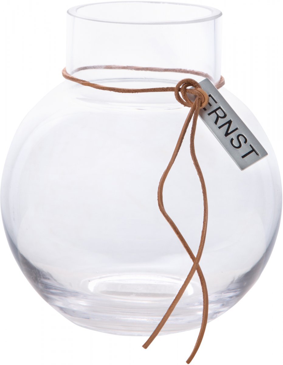 Läpikuultava lasivaasi, minkä korkeus on 14 cm. Vaasissa on nahkaremmi koristeena. Toimii kukkavaasina tai kynttilälyhtynä. Löytyy kolmen eri kokoisena.