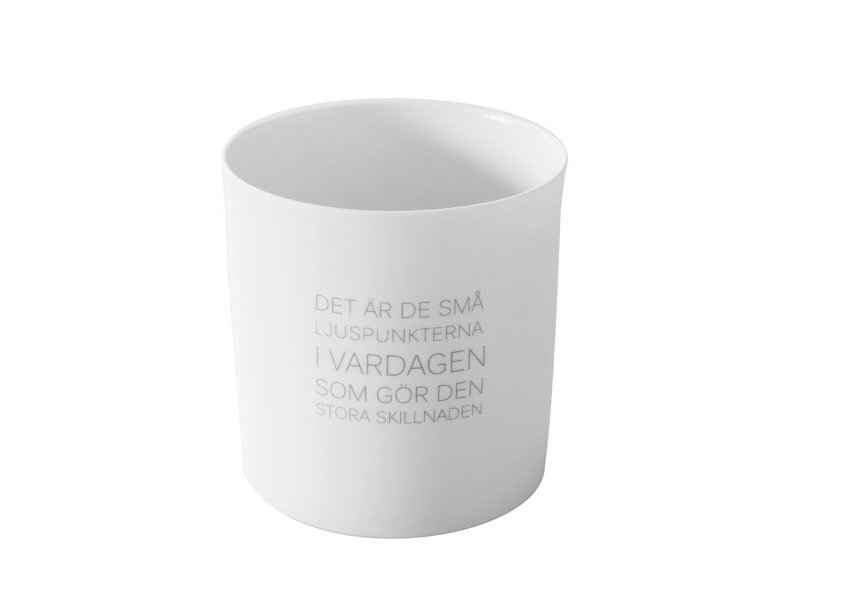 Valkoinen kynttilälyhty Ernst Kirchsteigerin harmaalla kirjoitetulla sitaatilla. Lyhty on tyylikäs ja valaisee kauniisti pimeät illat.