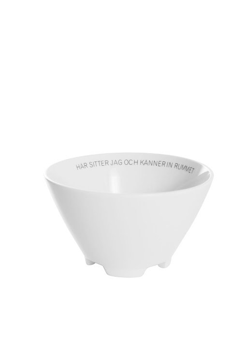 Valkoinen posliini kulho Ernst Kirchsteigerin sitaatilla: ”HÄR SITTER JAG OCH KÄNNER IN RUMMET”. Sarjaan kuuluu myös erilaisilla sitaateilla kirjoitettuja mukeja ja kulhoja.