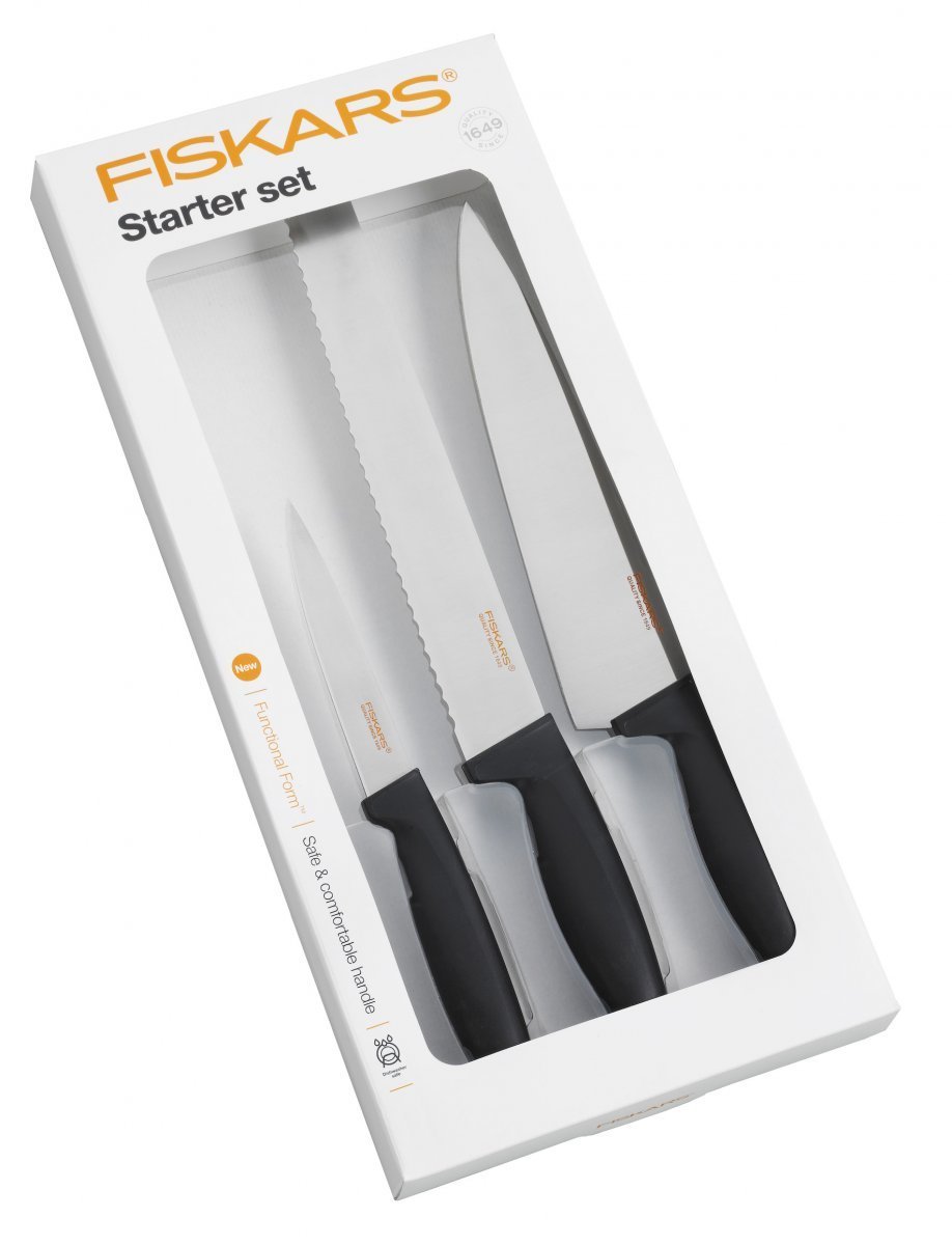 Aloitussetti sisältää vihannesveitsen, leipäveitsen ja kokinveitsen. Ostoksille!