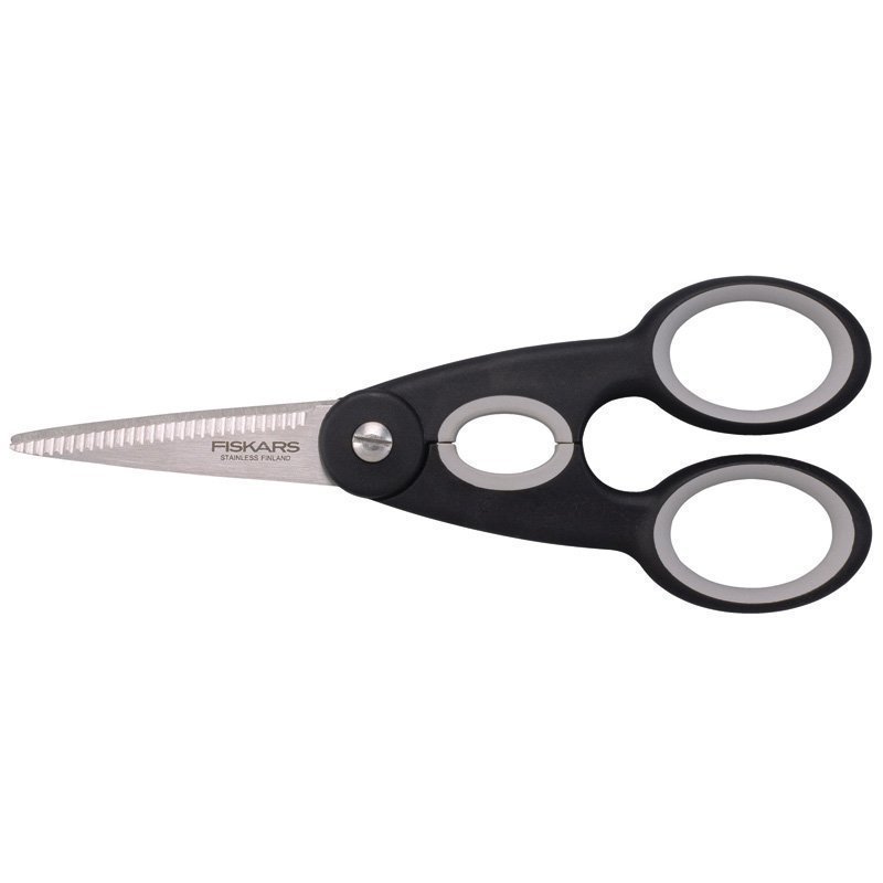 Keittiösaksien luistamattomat kädensijat lisäävät työskentelyn turvallisuutta. Kestävä ja terävä hammastettu alaterä tehostaa leikkaamista. Kahvojen välissä olevalla renkaalla voi avata kierrekorkit.
