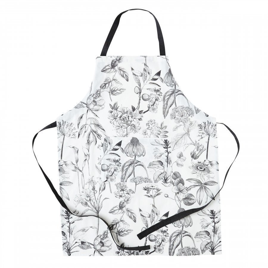 Esiliina, jossa painettu kukkakuvio. Suojaa hyvin vaatteita ruoanvalmistuksen aikana ja saa aloittelijankin näyttämään ammattilaiskokilta. Konepesu 40 asteessa.
