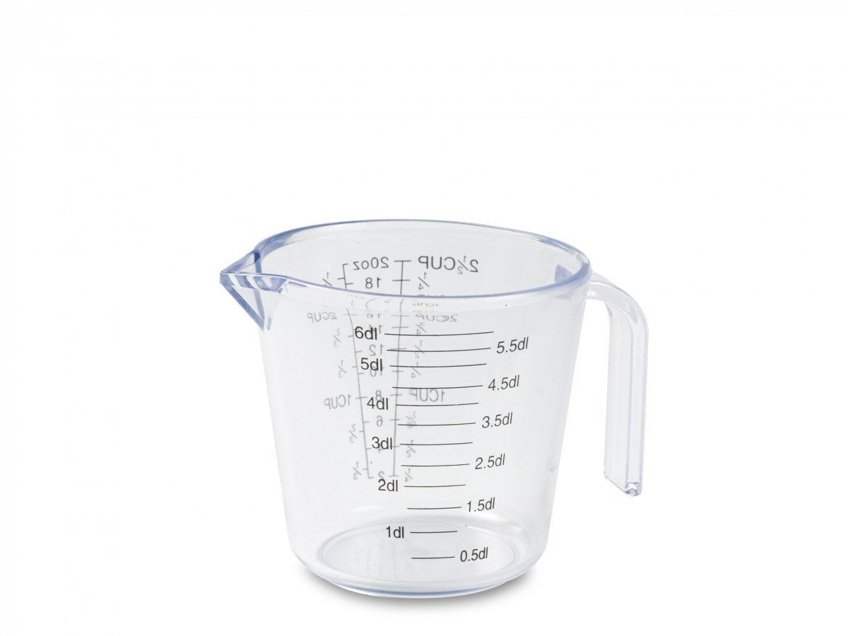 Sopii hyvin eri raaka-aineiden mittaukseen. Tilavuus 0.6 litraa. Konepesunkestävä.