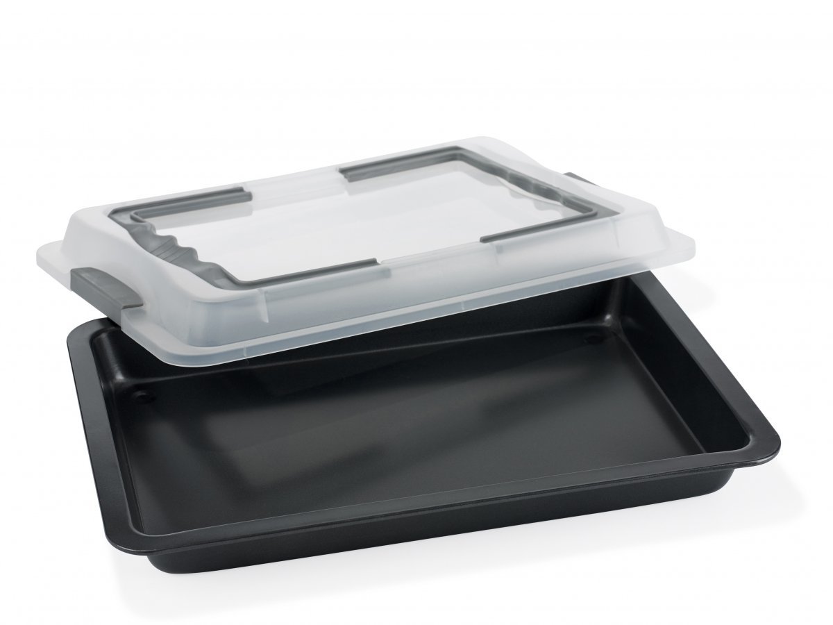 Käytännöllinen uunipannu kannella jossa on kätevät kahvat sopien hyvin leivonnaisten tai piirakan kuljetukseen. Uunipannussa on non-stick pinnoite ja se kestää lämpöä 230 asteeseeb asti. Suositellaan käsinpesua.