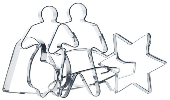 Viisi ruostumattomasta teräksestä valmistettua piparkakkumuottia, jotka on kaikki erimuotoisia; tähti, sydän, possu, mies ja nainen. Valikoimasta löytyy myös muita usean muotoisia muotteja.