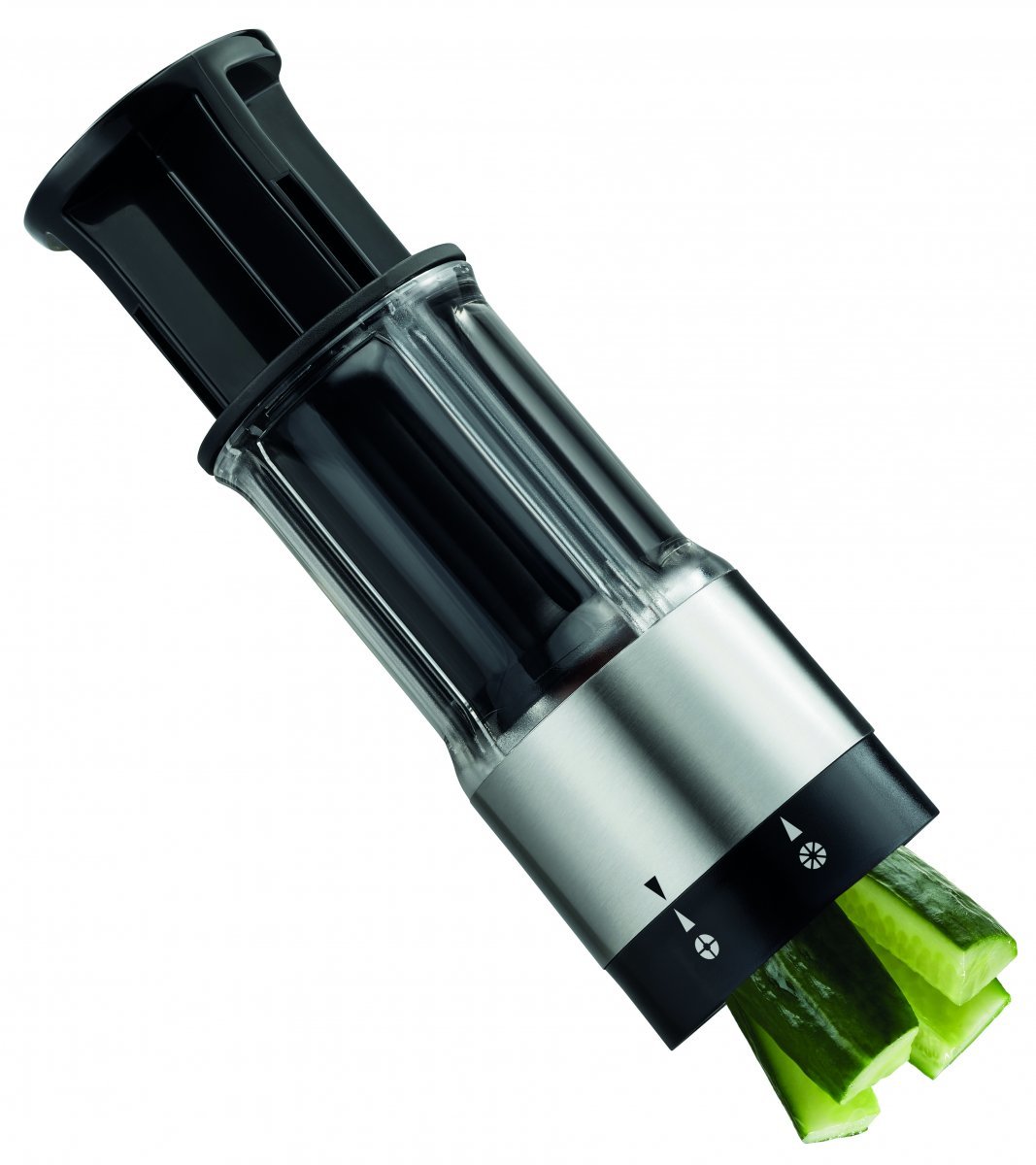 GEFUn Flexicut -leikkurilla voi paloitella vihannekset ja tehdä lohkoperunat sekä hedelmäsalaatin nopeasti. Leikkurissa on säädettävä ruostumattomasta teräksestä valmistettu japanilainen terä, jolla saa aikaan erilaisia palasia raaka-aineista.