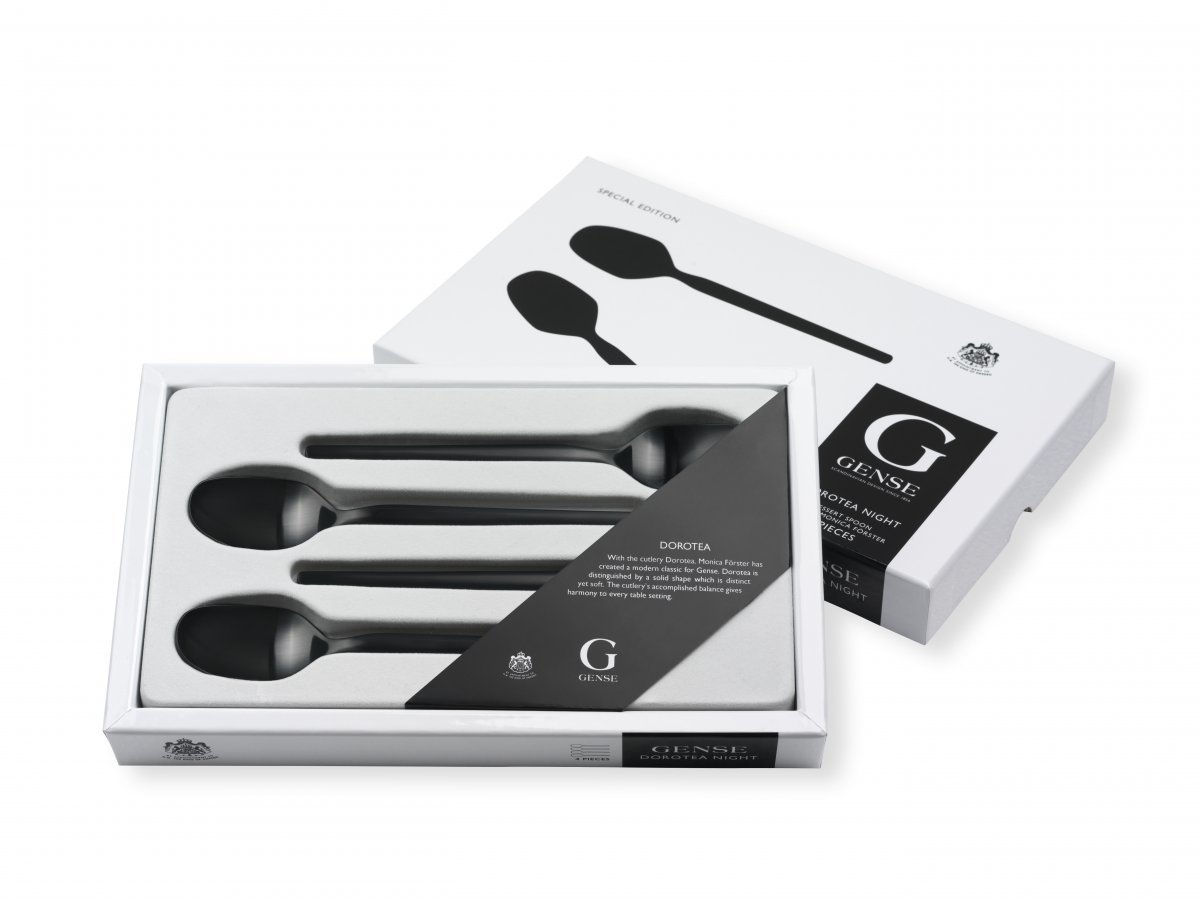 Dorotea Night -jälkiruoka aterinsetti koostuu neljästä jälkiruokalusikasta. Monica Förstersin suunnitteleman sarjan aterimet sopivat niin perinteiseen kuin moderniin kattaukseen. Aterimet eivät kestä konepesua.
