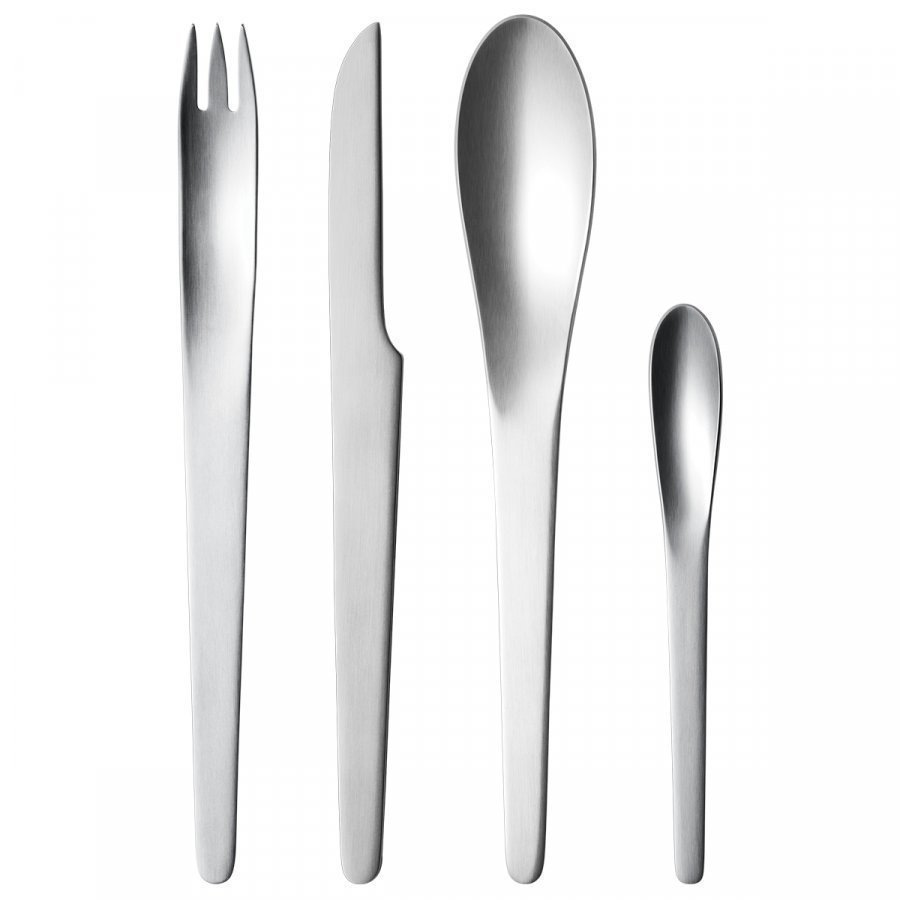 Arne Jacobsen suunnitteli nämä minimalistiset mattapintaiset teräsaterimet vuonna 1957 Kööpenhaminassa sijaitsevaan SAS Royal -hotelliin. Aterimet sopivat käteen hyvin ja niiden saumaton muoto tuo eleganssia kattaukseen. On helppo ymmärtää, miksi näitä aterimia kutsutaan ”aterimiksi ilman krumeluuria” – yksinkertaisen tyylikäs muotoilu on silmiinpistävän modernia ja kiehtovaa vielä tänäkin päivänä. Arne Jacobsen -ruokailuvälinesarja sisältää kuusi ruokalusikkaa, kuusi ruokahaarukkaa, kuusi pitkää grilliveistä ja kuusi teelusikkaa.